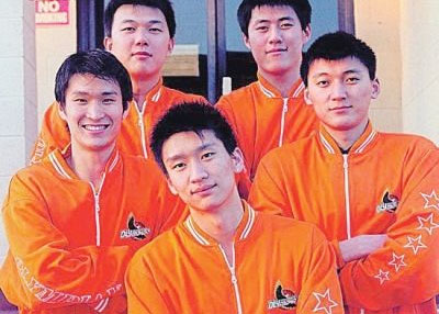 “奥神五虎”合影。前排从左至右:霍楠、孙悦、金鑫。后排左为黄海贝,右为张松涛。