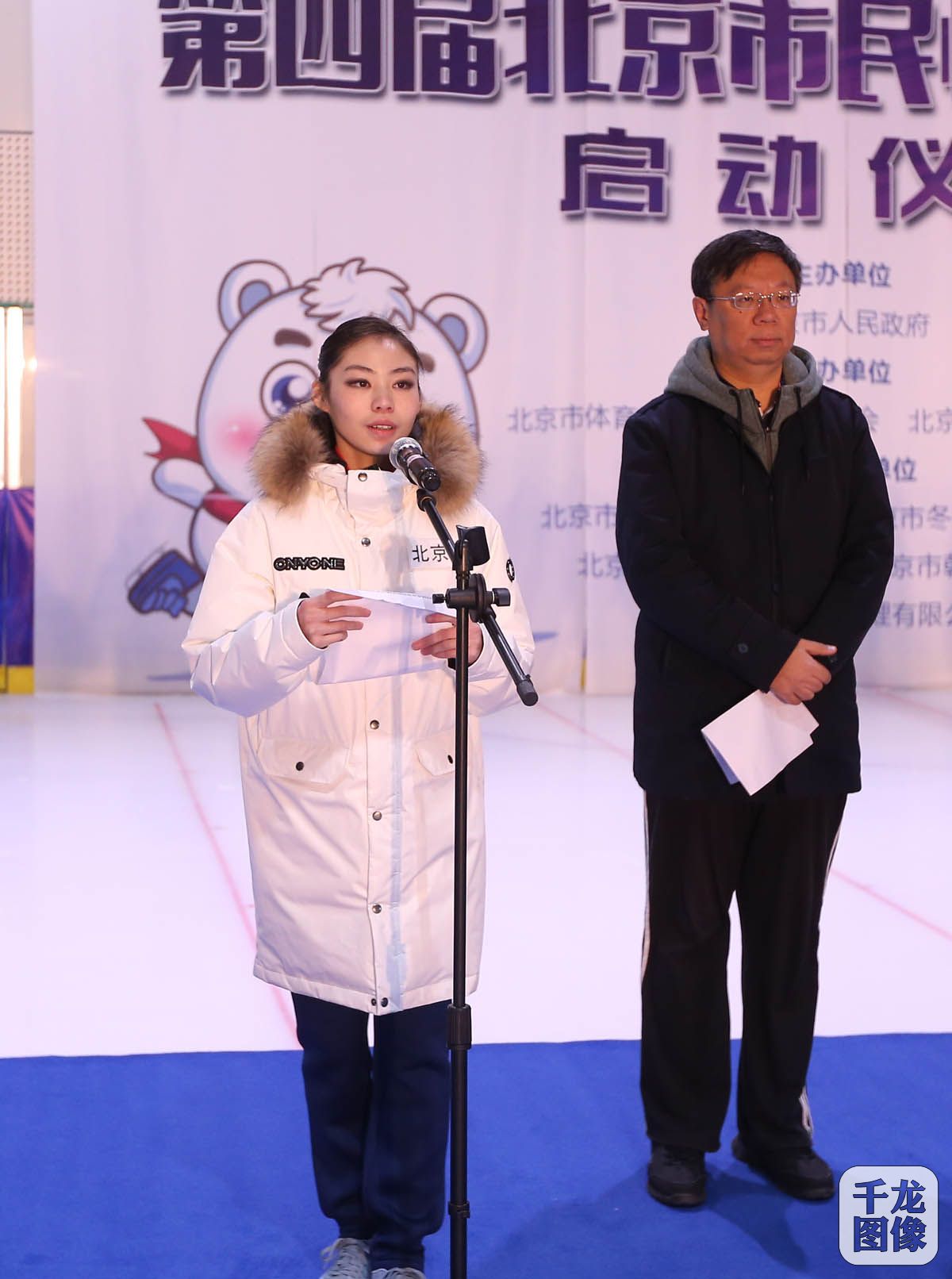 11月19日,第四届北京市民快乐冰雪季启动仪式在华星国际冰上运动中心举行,北京市体育局党组书记、局长孙学才致开幕辞并宣布冰雪季开幕。图为双人滑世界冠军于小雨发出了“了解冬奥,培养冰雪运动兴趣;参与冬奥,养成冰雪运动习惯;携手冬奥,引领全民健身风尚”的倡议。千龙网记者 戚连民摄