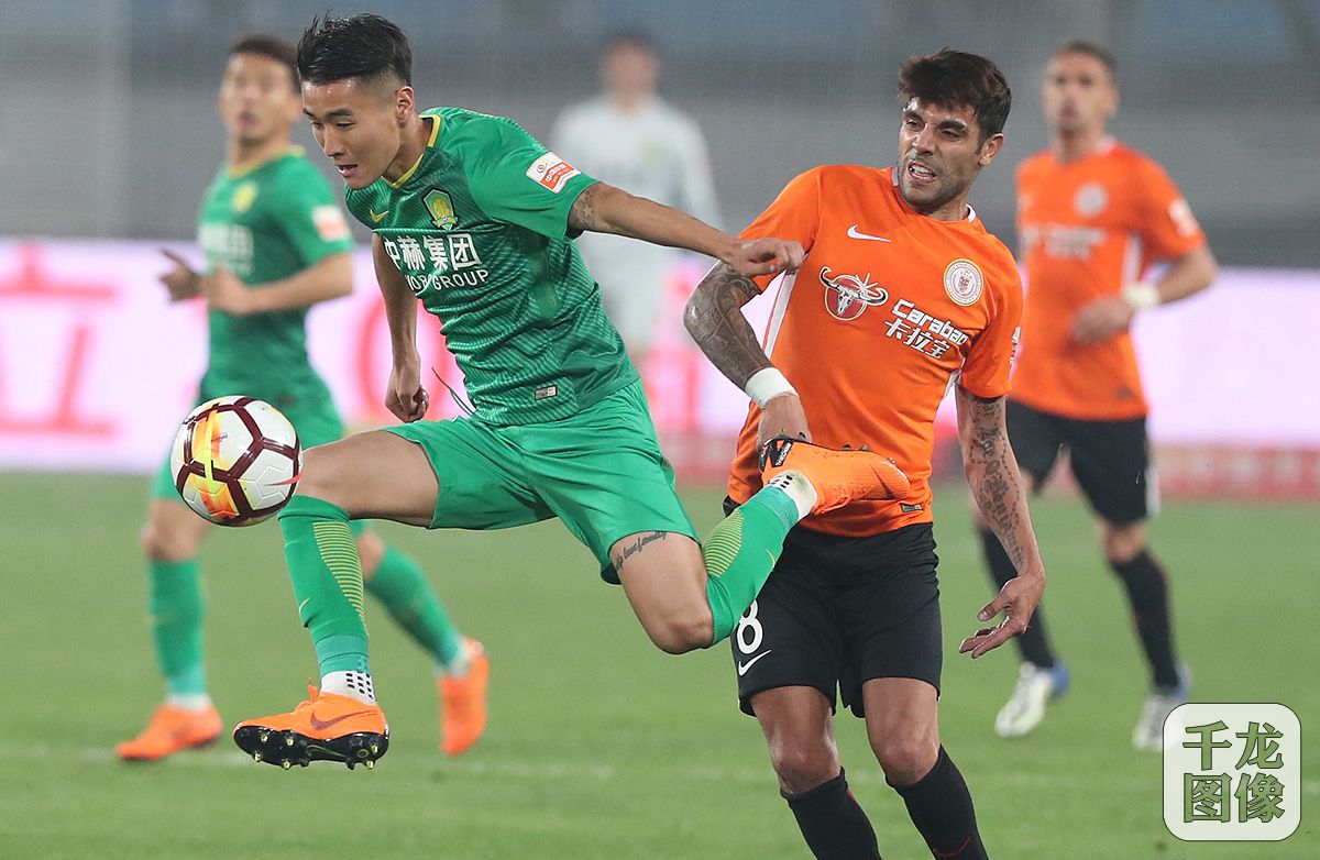 3月31日,2018赛季中超联赛第4轮,北京中赫国安主场迎战北京人和,上演首次京城德比。结果上半场索里亚诺主罚任意球建功,下半场于洋、比埃拉先后破门,于大宝点球再下一城,最终北京中赫国安在主场4比0战胜北京人和。图为本场比赛精彩瞬间。千龙网记者 戚连民摄