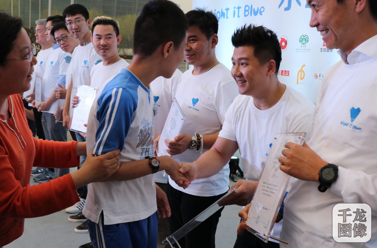 千龙网北京4月3日讯(记者 戚连民)为迎接世界第十一个“孤独症关注日”的到来,为推动社会聚焦孤独症人群,让星星的孩子不再孤独的闪烁,北京市体育基金会4月2日携手RunningTogetter跑团联盟,在水立方组织举办了“2018水立方点亮蓝灯暨‘勇敢爱 与众不同’全球联跑活动”。15名热心公益的蓝爸爸包括奥运冠军陈一冰,新浪高级副总裁魏江雷,民谣歌唱组合水木年华成员缪杰等,以认领星宝贝画作制成的头巾方式,帮助星宝贝发声。