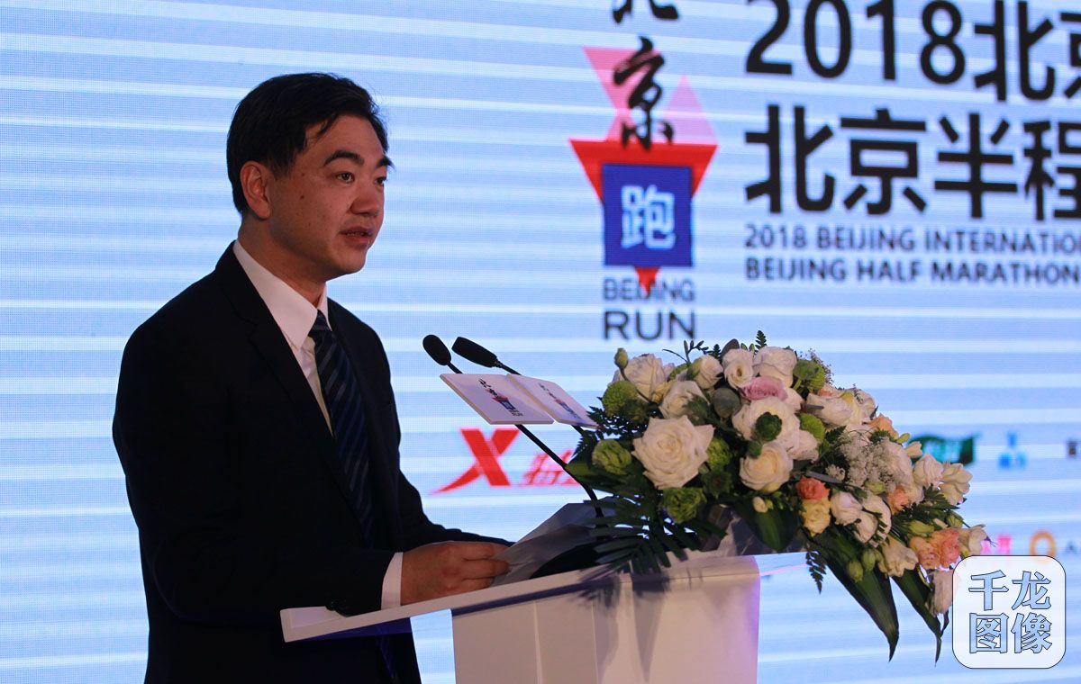 4月4日,2018北京跑新闻发布会在京举行,赛事主办方北京市体育局、中国田径协会在京宣布共有20000名选手参加半程马拉松项目,终点位于奥林匹克公园中心区庆典广场。图为北京市体育竞赛管理中心副主任王刚致辞。千龙网记者 戚连民摄
