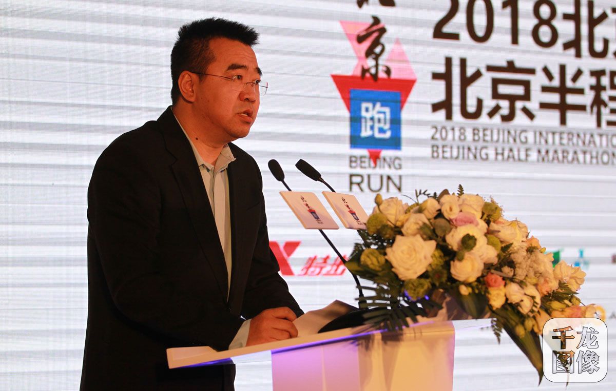 4月4日,2018北京跑新闻发布会在京举行,赛事主办方北京市体育局、中国田径协会在京宣布共有20000名选手参加半程马拉松项目,终点位于奥林匹克公园中心区庆典广场。图为盛力世家(上海)体育文化发展有限公司时光致辞。千龙网记者 戚连民摄