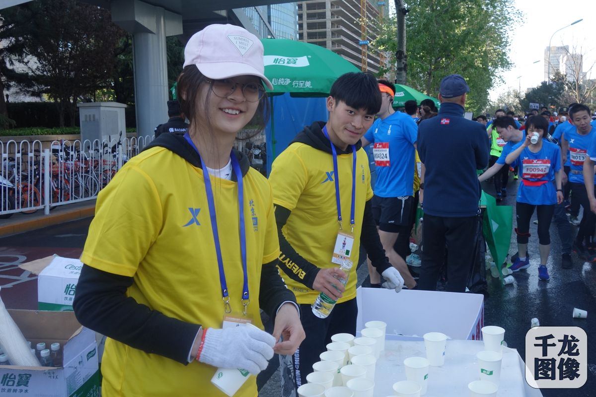 4月15日,2018北京国际长跑节·北京半程马拉松鸣枪。图为朝阳门水站的志愿者正在为跑者服务。千龙网记者 黄业摄