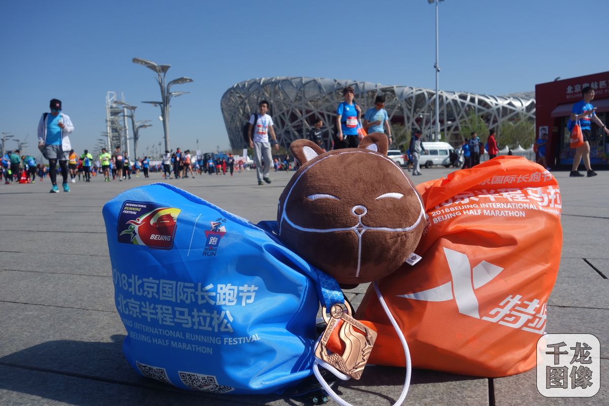 4月15日,2018北京国际长跑节·北京半程马拉松鸣枪。本次比赛设半程马拉松和家庭亲子跑两个项目,分别在天安门广场和奥林匹克公园中心区同时出发。图为千龙兔爷和完赛包、参赛包以及奖牌合影。千龙网记者 黄业摄