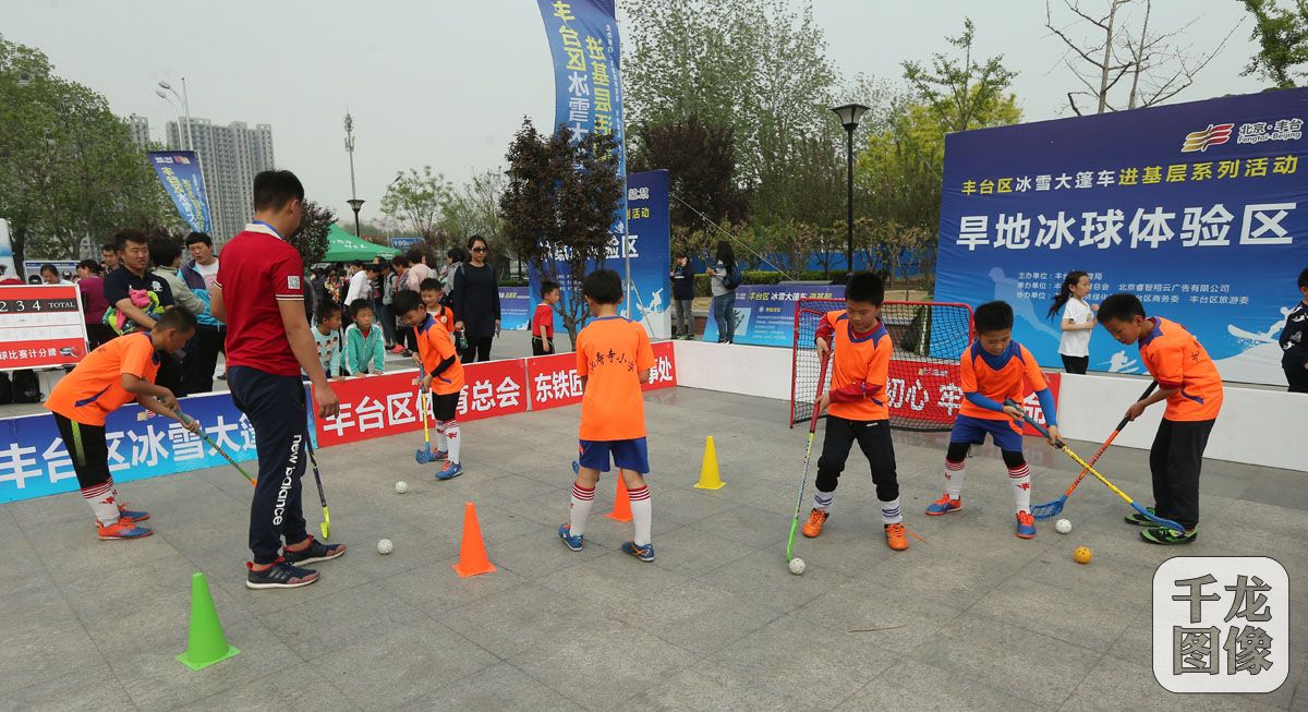4月19日,由丰台区体育局主办的“冰雪大篷车”进基层活动在东铁匠营街道新业广场完美收官,活动共惠及153个社区,45个行政村,直接参与活动群众达12000人,为北京2022年冬奥会营造了浓厚氛围。图为成寿寺小学学生在新业广场体验旱地冰球。千龙网记者 戚连民摄