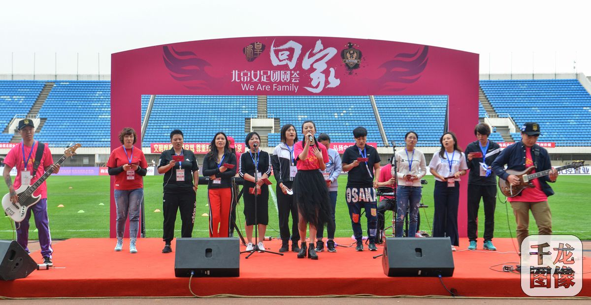5月5日,“凤凰回家——北京女足团圆荟”庆典活动在先农坛体育场举行,樊春玲、满艳玲、曹玥、李洁,任丽萍,王丹丹,汪玲玲,潘菲,王立明,张雯,马自翔,裴嘉文等老女足队员有参加,俱乐部向她们颁发了精致的金质奖牌,并附上了对“凤凰姑娘们”的礼赞。图为老队员共同演唱《铿锵玫瑰》。千龙网记者 戚连民摄