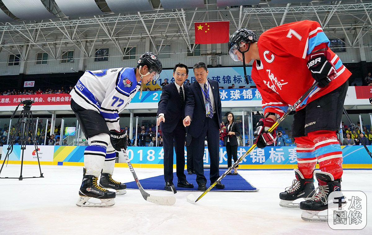 5月7日,2018年全国冰球锦标赛开幕式在奥众冰球运动俱乐部举行。来自全国的28支队伍将参加本次比赛,包括北京首钢冰球队(男队)和北京女子冰球队。这是冬奥会进入“北京周期”后首次在京举行的全国性冰雪赛事,也是全国冰球锦标赛历史上规模最大的一届比赛。图为国际冰球联合会副主席胡文新、北京市体育局局长赵文(右)为比赛开球。千龙网记者 戚连民摄