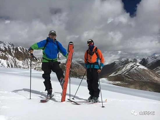 尼玛次仁(左)在位于西藏拉萨市的洛堆峰体验滑雪登山