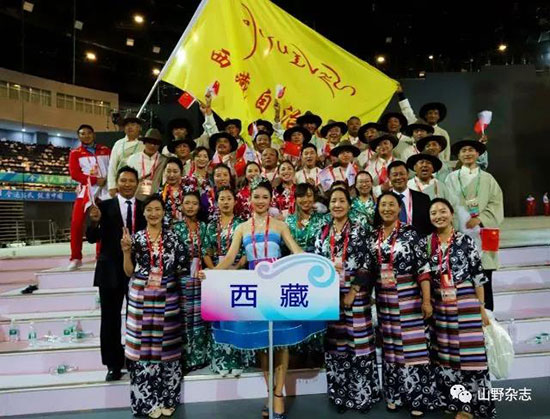 2017年8月27日,尼玛次仁(第二排左一)在第十三届全国运动会开幕式上与西藏代表团成员合影留念