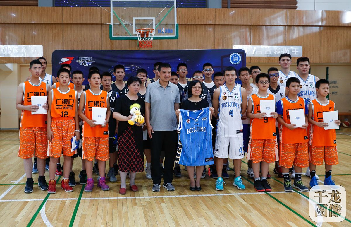 5月31日,北京首钢篮球“雏鹰计划”校园行活动的第一站在广渠门中学举行,首钢体育雏鹰计划总负责人、首钢篮球总教练闵鹿蕾和首钢男篮队员朱彦西、张才仁、王旭、塔瑞克·加尼尤来到学校,与学生们进行篮球游戏。图为首钢篮球总教练闵鹿蕾和首钢男篮队员朱彦西、张才仁、王旭、塔瑞克·加尼尤与学生集体合影。千龙网发 北京首钢篮球俱乐部供图