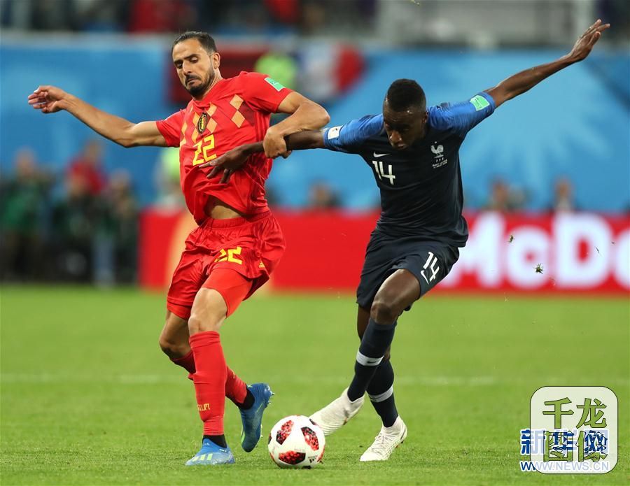 7月10日,比利时队球员沙德利(左)与法国队球员马图伊迪在比赛中拼抢。当日,在圣彼得堡进行的2018俄罗斯世界杯足球赛半决赛中,比利时队以0比1不敌法国队,无缘决赛。 新华社记者费茂华摄
