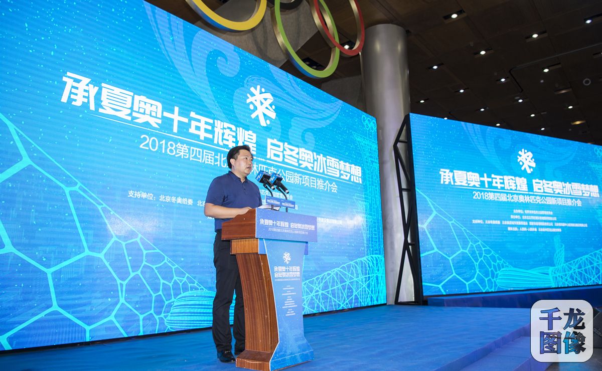 7月26日,以“承夏奥十年辉煌 启冬奥冰雪梦想”为主题的2018年第四届北京奥林匹克公园新项目推介会在鸟巢文化中心零层活动大厅开幕。图为北京奥林匹克公园管委会常务副书记、常务副主任杨洪福在开幕式上致辞。千龙网发 夏波光摄