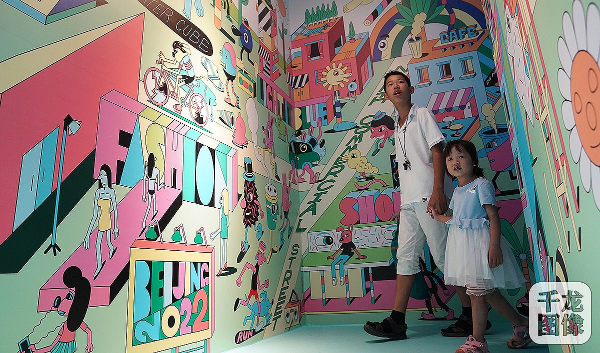 9月8日,水立方艺术季——国际艺术家杰里米·威乐插画文创交流沙龙在水立方举行。图为观众参观以水立方为创作对象的插画作品。千龙网记者 戚连民摄