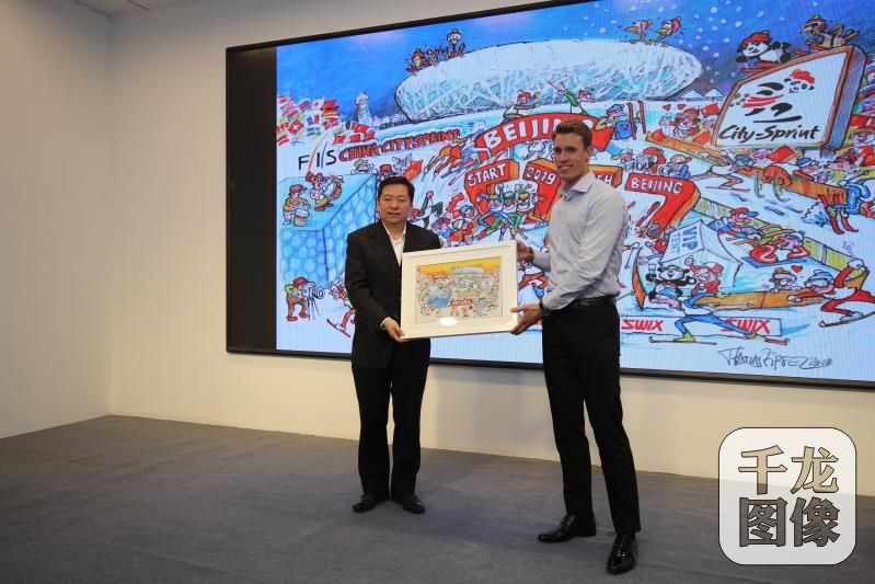 9月20日,国家体育总局冬季运动管理中心和北京市体育局在京宣布,国际雪联两项重要赛事落户北京,2019年3月国际雪联中国北京越野滑雪积分大奖赛将在鸟巢、首钢和延庆连办三站。同时国际雪联中国北京滑轮世界杯2019年7月4日-6日在北京举行。图为北京市体育局副局长向来宾赠送赛事宣传漫画。千龙网发 主办方供图