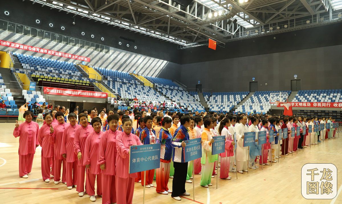 9月28日,2018年京津冀社会体育指导员交流展示比赛大兴分站赛9月28日在大兴新城体育中心举行。图为来自北京市丰台区、通州区、大兴区、开发区、天津市、河北省地区的50余支代表队、1000名社会体育指导员参加了比赛。千龙网发 主办方供图