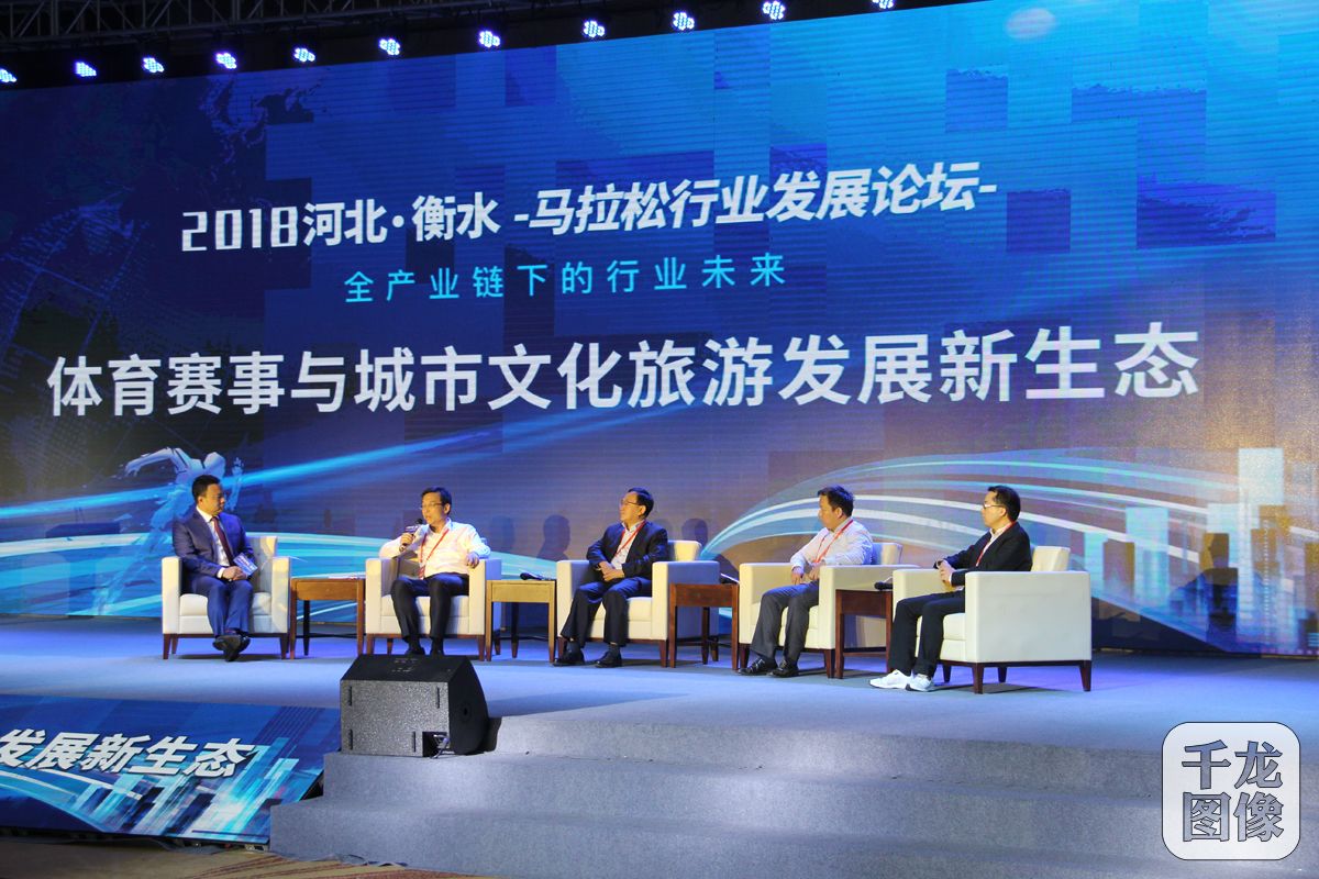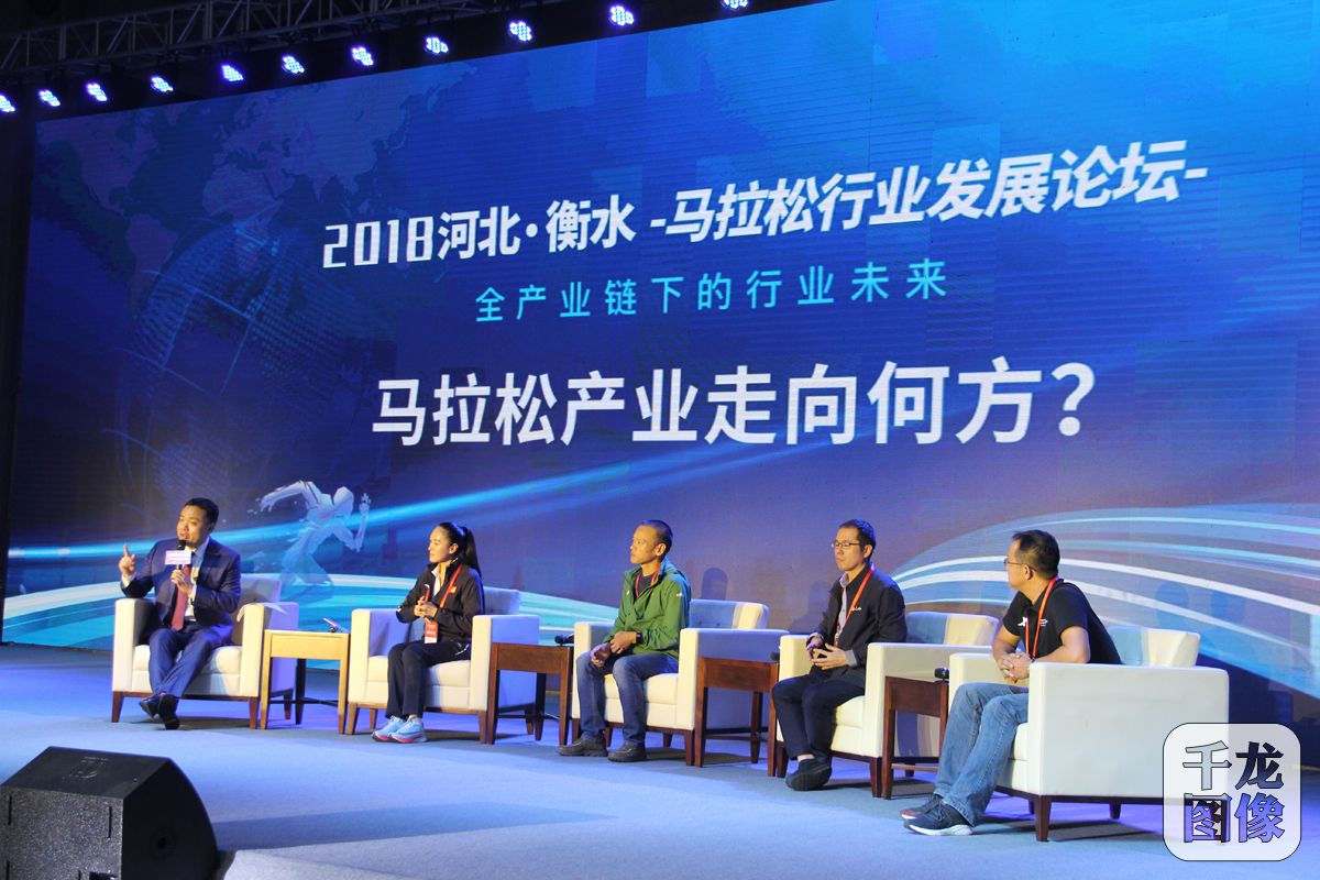 9月28日,2018河北·衡水马拉松行业发展论坛举行。图为马拉松世界冠军孙英杰(左二)与张炜、陈远丁、游海滨等嘉宾一起就马拉松话题展开讨论。千龙网记者 黄业摄