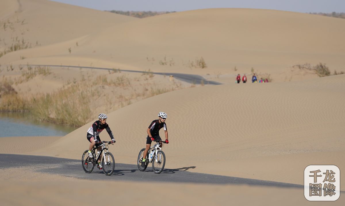 10月20日,2018中国体育旅游露营大会在新疆尉犁县国家4A级风景区罗布人村寨举行。为期两天的大会吸引了来自全国各地近千名户外爱好者参加。图为沙漠骑行挑战赛。千龙网发 萧峰摄