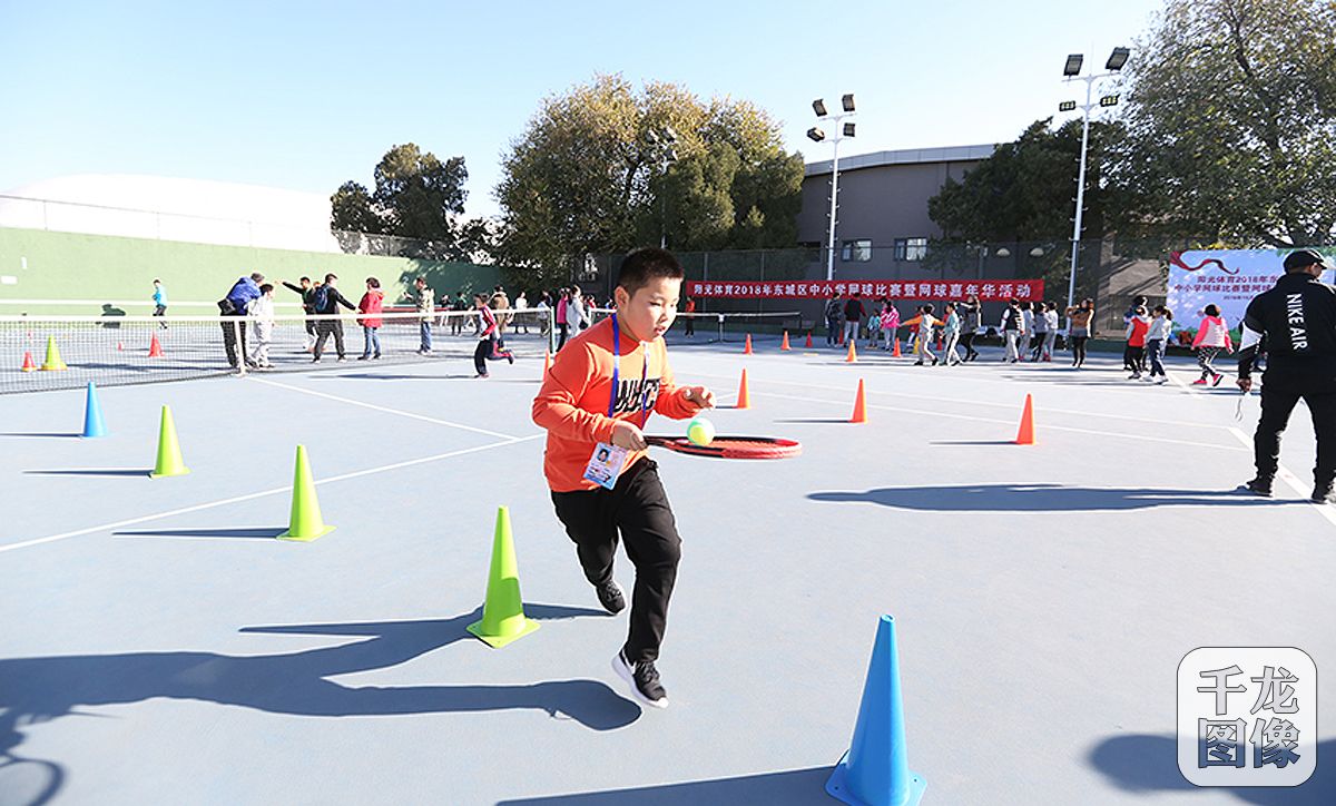 10月27日,阳光体育2018年东城区中小学网球比赛在北京天坛体育中心举行。经过激烈的角逐,史家胡同小学获得小学团体比赛第一名,广渠门中学获得中学团体比赛第一名。图为活动现场学生们通过嘉年华和比赛感受网球运动带来的乐趣。千龙网发 主办方供图