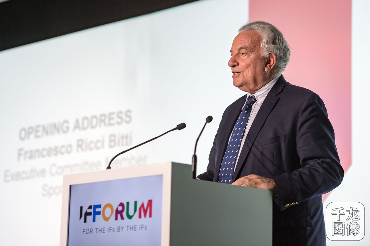 瑞士洛桑当地时间5日晚,在2018年国际单项体育联合会论坛开幕式上,世界体育大会主办方宣布北京成为2020年第18届世界体育大会主办城市。图为世界体育大会执委、夏季奥运项目国际单项体育联合会总会主席弗朗塞斯科·里奇·比蒂致辞。千龙网发 北京奥运城市发展促进会供图