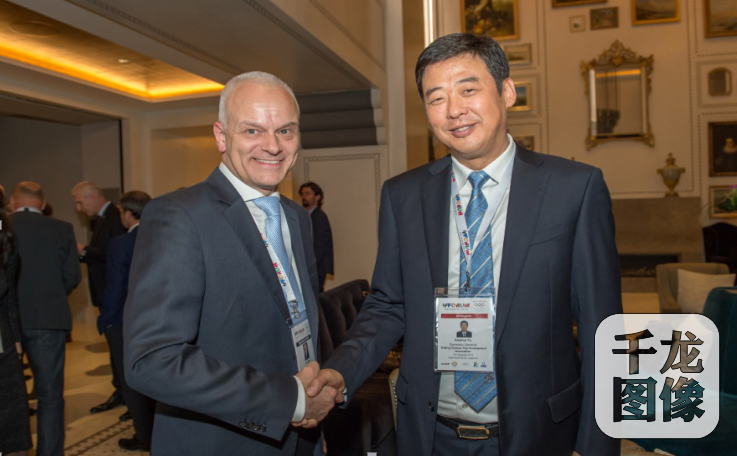 瑞士洛桑当地时间5日晚,在2018年国际单项体育联合会论坛开幕式上,世界体育大会主办方宣布北京成为2020年第18届世界体育大会主办城市。图为世界体育总会执行主任尼斯哈特向北京奥运城市发展促进会秘书长、北京奥运城市发展促进中心主任付晓辉表示祝贺。千龙网发 北京奥运城市发展促进会供图
