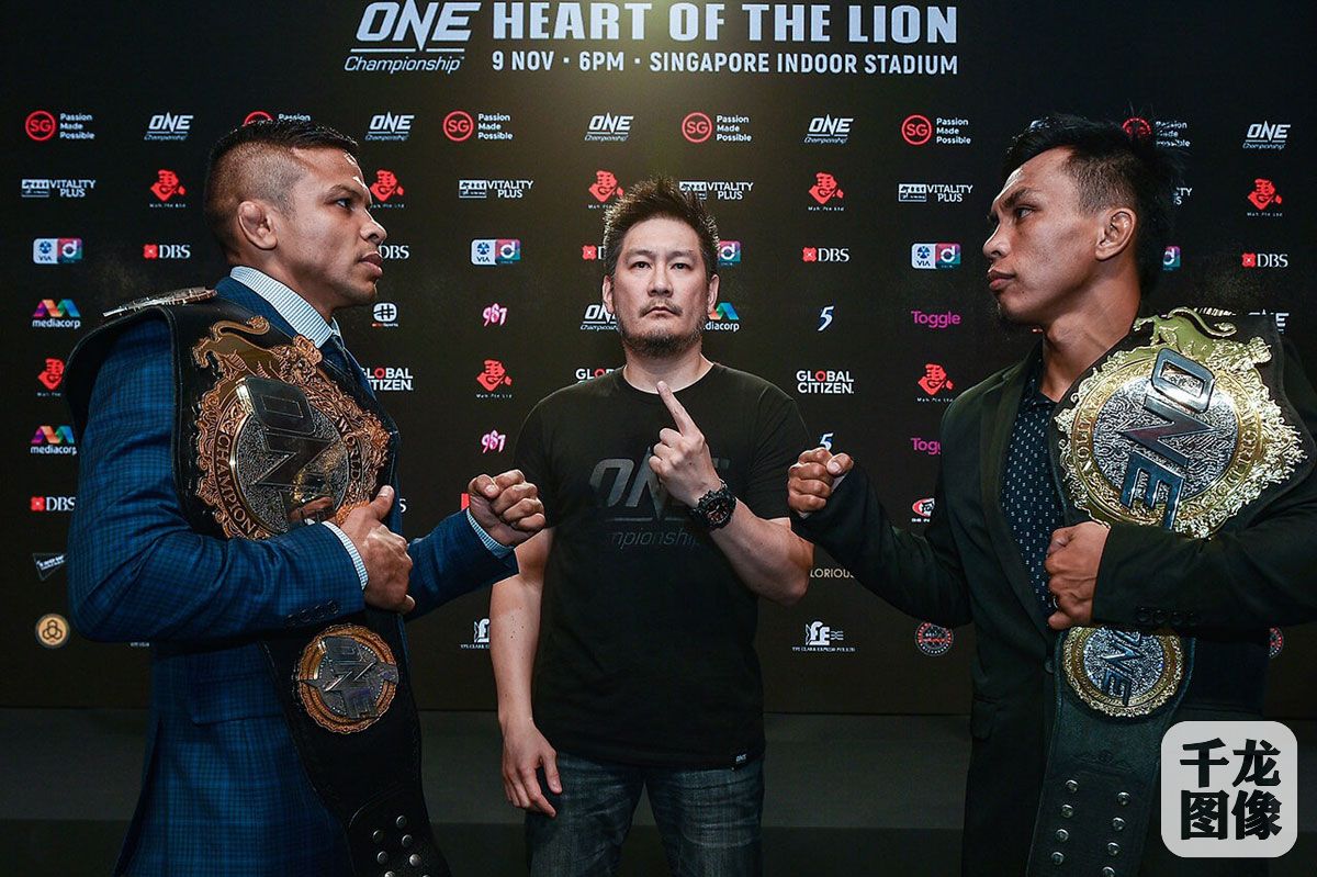 11月7日,ONE:雄狮之心的大型格斗赛事举行赛前新闻发布会。图为头条主赛的两位选手——“巴西闪电”比比亚诺·费尔南德斯(左一)和“沉默者”凯文·贝灵刚(右一)。中间的是ONE冠军赛CEO查特里·西尤堂。千龙网发 赛事组委会供图。