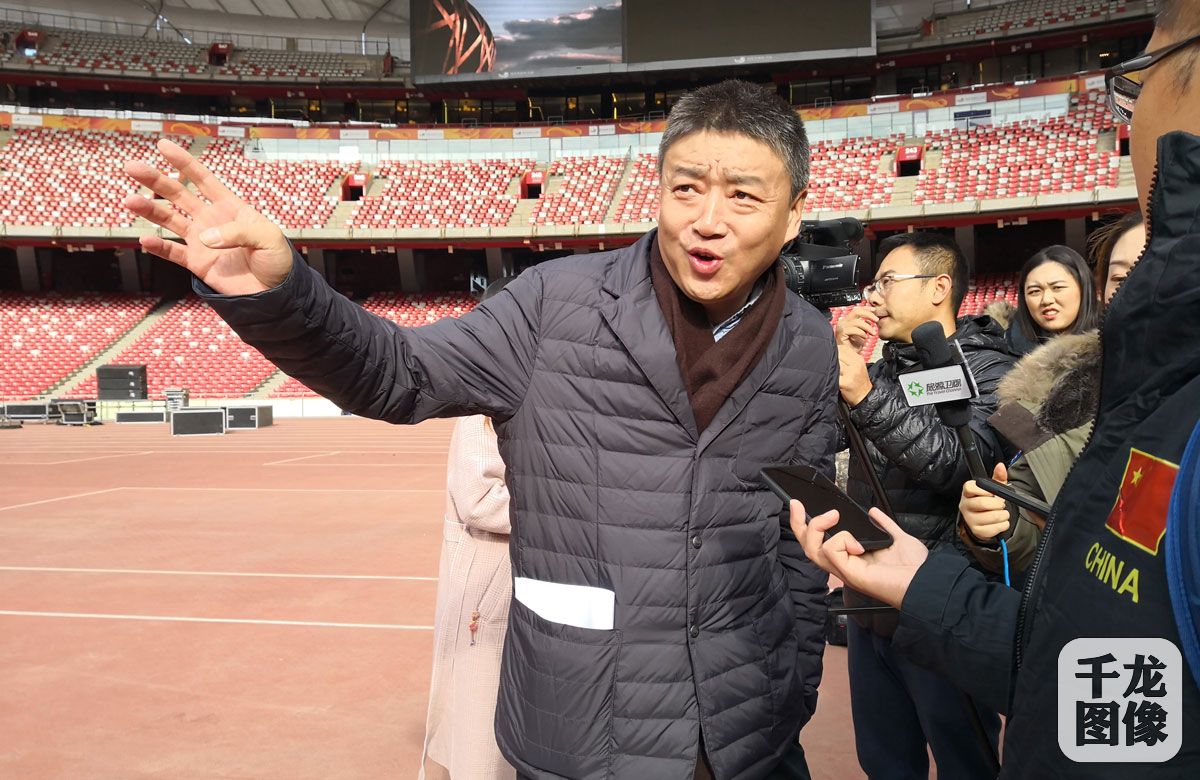 11月23-24日,2018年沸雪北京国际雪联单板滑雪大跳台世界杯在鸟巢举行,鸟巢场内搭建工作紧锣密鼓进行中,目前正在进行碎冰造雪作业。图为北京市体育竞赛管理中心主任邵晓军接受采访介绍赛事的筹备情况。千龙网记者 戚连民摄
