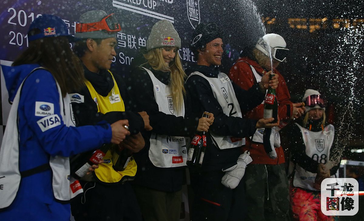 11月24日,2018沸雪北京国际雪联单板滑雪大跳台世界杯在鸟巢落下帷幕,经过两日的激烈比拼,最终,来自瑞典的黑马选手斯文·索格伦和奥地利名将安娜·加塞尔分别获得男子、女子组冠军。图为颁奖仪式。千龙网记者 戚连民摄
