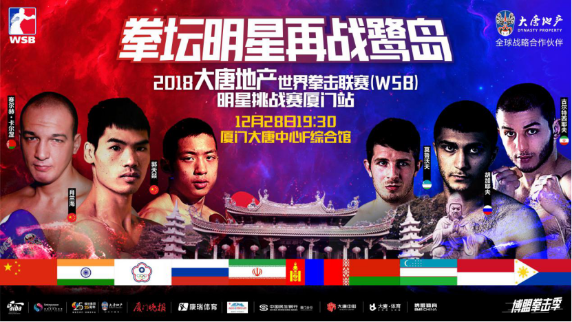 12月28日晚19:30,敬请关注大唐地产世界拳击联赛(WSB)明星挑战赛厦门站精彩赛,2018“博盟拳击季”收官之战与您在福建厦门大唐中心F综合馆不见不散!