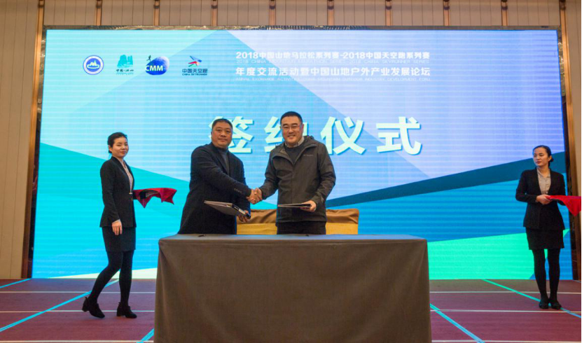 在活动现场,北京南天星体育产业发展有限公司总经理郭子辉与重庆市黔江区、山东省五莲县、信阳市鸡公山、广州市从化区、武汉市新洲区5个山地马拉松赛事举办地代表签署了战略合作协议。