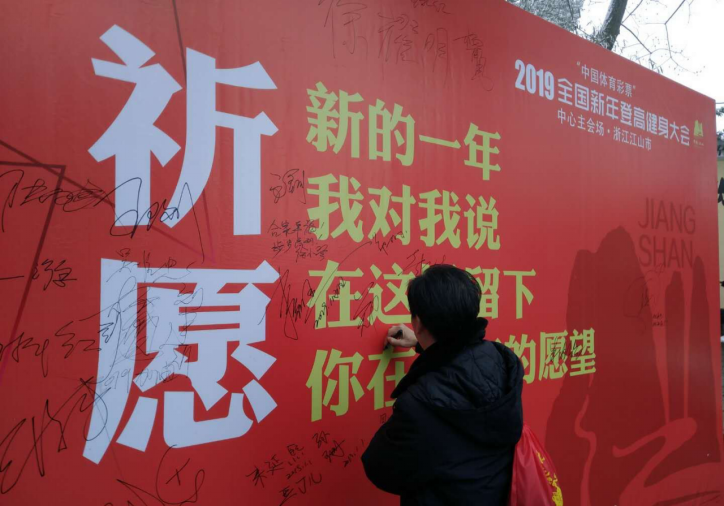活动当天,数以万计的各地市民和户外运动爱好者通过攀登江郎山来表达对新年的祈愿。活动还未开始,位于江郎山脚下开明禅寺的前广场围栏上就已经绑满了大家的新年心愿。随着登高健身大会的正式开幕,浩浩荡荡的人群一拥而上,不管大人、老人还是小孩,大家都是卯足了劲,相互加油鼓劲,希望能够借登高为新的一年带来好兆头。记者采访了不同身份的登高群众,聆听了他们的新年心愿:即将面临高考的学生们,希望自己能够考上理想的学府;一位老人则是盼望孙女能够在今年找到她的另一半;一位先生已经把带家人去西藏旅行列入了新一年的计划;婚期将至的情侣则是憧憬着去大理拍摄婚纱照,举行最美好的婚礼;还有两位准妈妈,已经迫不及待地想要看到她们的“金猪宝宝”健康出生,快乐成长。而更多的群众则是希望祖国繁荣富强,生活幸福美满。