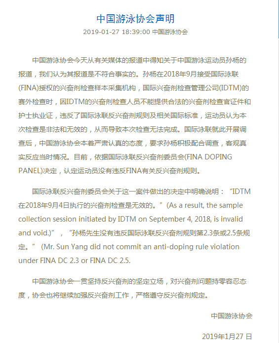 中国游泳协会今天从有关媒体的报道中得知关于中国游泳运动员孙杨的报道,我们认为其报道是不符合事实的。孙杨在2018年9月接受国际泳联(FINA)授权的兴奋剂检查样本采集机构,国际兴奋剂检查管理公司(IDTM)的赛外检查时,因IDTM的兴奋剂检查人员不能提供合法的兴奋剂检查官证件和护士执业证,违反了国际泳联反兴奋剂规则及相关国际标准,运动员认为本次检查是非法和无效的,从而导致本次检查无法完成。国际泳联就此开展调查后,中国游泳协会本着严肃认真的态度,要求孙杨积极配合调查,客观真实反应当时情况。目前,依据国际泳联反兴奋剂委员会(FINA DOPING PANEL)决定,认定运动员没有违反FINA有关反兴奋剂规则。