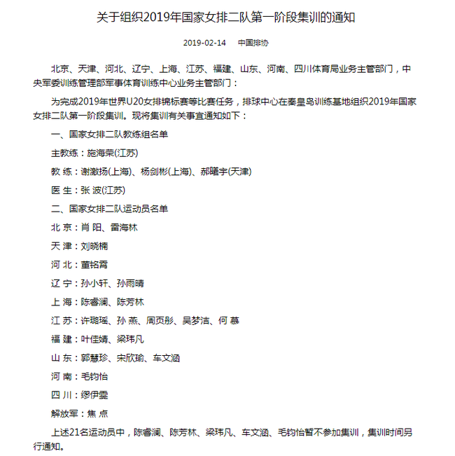 为完成2019年世界U20女排锦标赛等比赛任务,排球中心在秦皇岛训练基地组织2019年国家女排二队第一阶段集训。现将集训有关事宜通知如下: