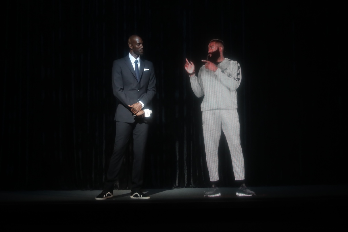 图4:加内特和以全息投影方式“空降·”的神秘嘉宾詹姆斯·哈登互动