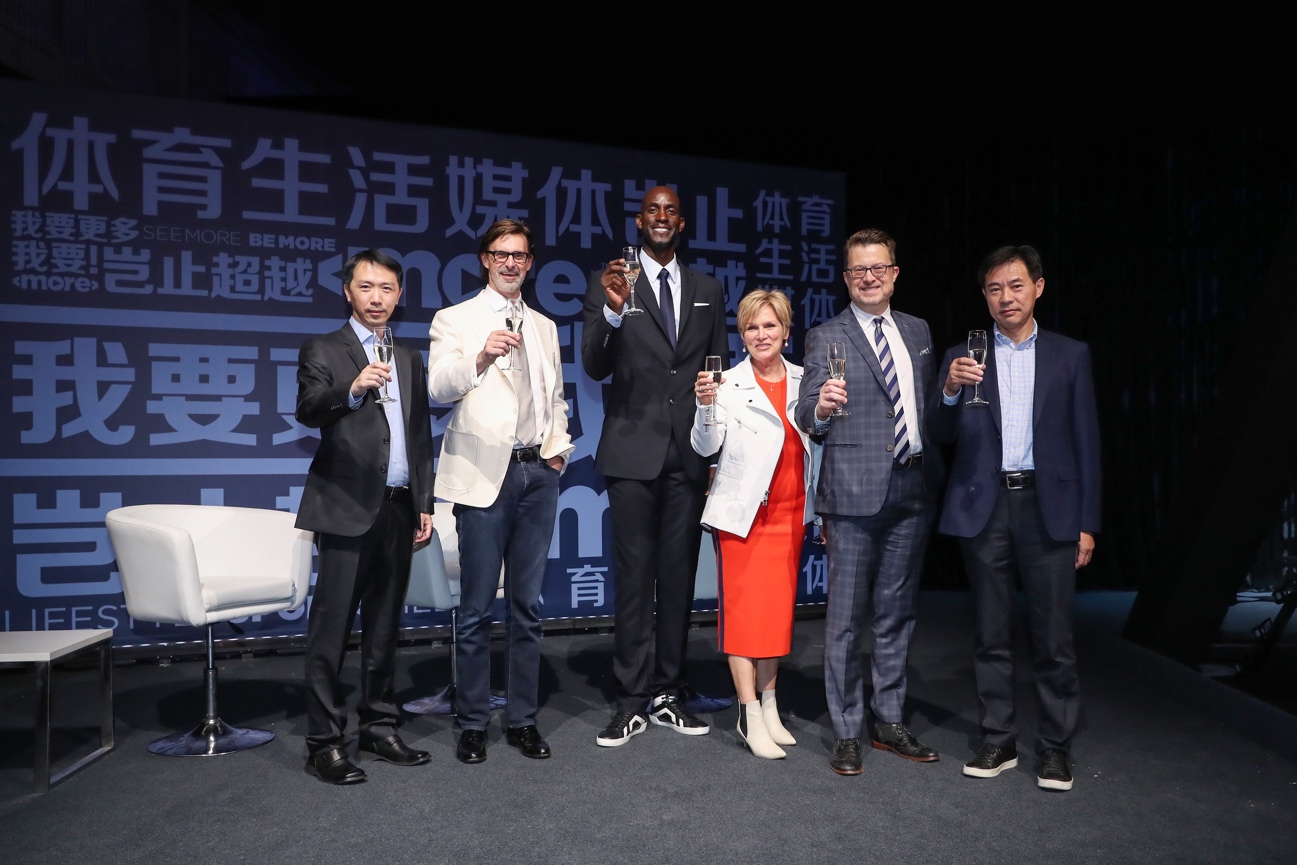 图2:MORE体育首席技术官张淼(Mervin Zhang)、MORE体育创始人兼首席执行官布鲁克斯·布兰奇(Brooks Branch)、传奇巨星凯文·加内特(Kevin Garnett)、MORE体育品牌创意总监梅兰尼·派考思(Melanie Paykos)、MORE体育人才及品牌高级副总裁比尔·桑德斯(Bill Sanders)、MORE体育执行董事曾新群(Aaron Zeng) 共同举杯庆祝MORE体育进驻中国(从左至右)