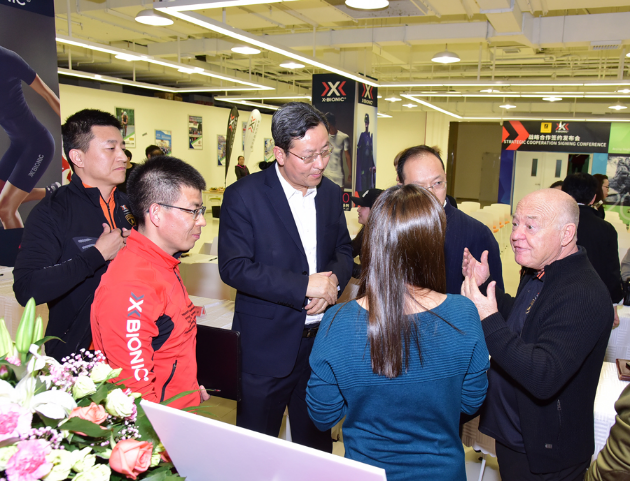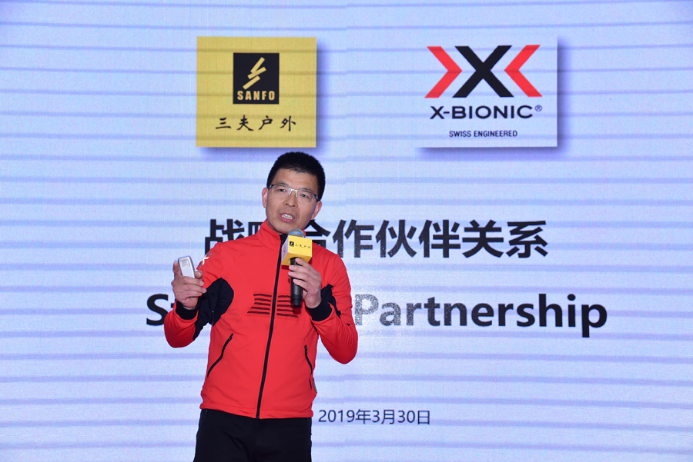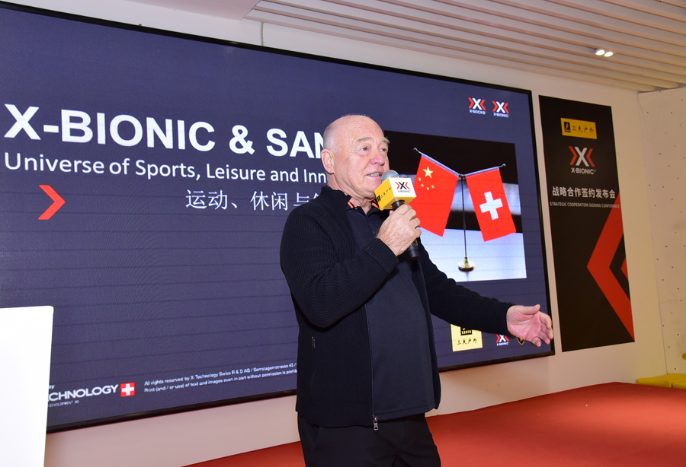X-BIONIC品牌创始人、公司董事会主席Bodo Wilhelm Dr. Lambertz向现场的嘉宾介绍了X-BIONIC产品卓越的科技性能。他说,X-BIONIC的产品曾通过瑞士联邦国家实验室的权威检测,可以帮助运动者真正实现“将汗水转化为能量”。在他看来,X-BIONIC与三夫户外有着共同的精神和理念,这为双方合作奠定了坚实的基础。