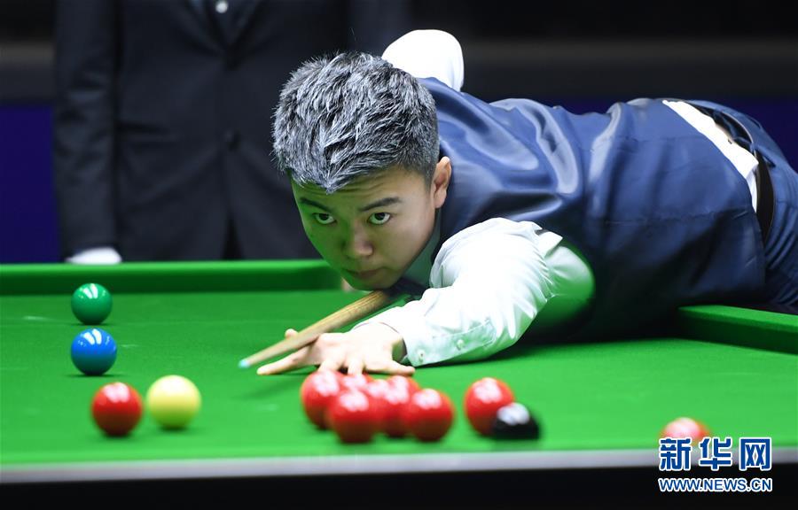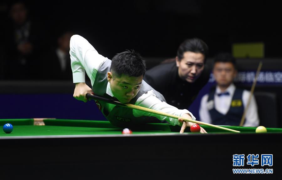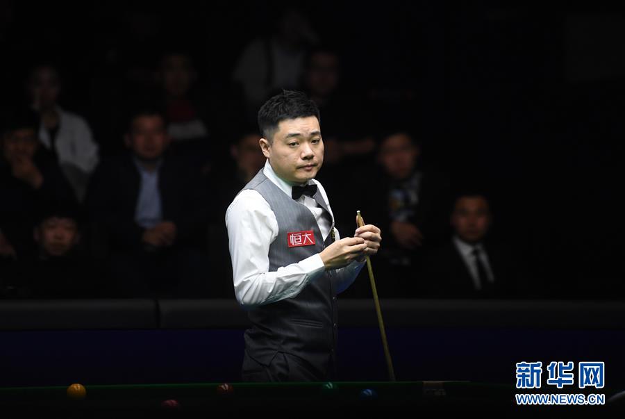 4月1日,丁俊晖在比赛中。 当日,在北京举行的2019年世界斯诺克中国公开赛资格赛中,中国选手丁俊晖以6比1战胜中国选手张健康,晋级下一轮。 新华社记者李俊东摄