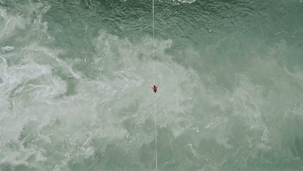 在等待天气好转后,赖张开始迎接挑战,不过他刚一上扁带就发生意外,从扁带上冲坠,现场局面十分惊险。不过防护措施十分完备,这次意外有惊无险。在回忆那一刻时,赖张甚至有些“享受”,“我刚上去很不适应,一下就掉下来了,但是挂在江面上看着周围壮观的景象,我很快放松下来。”