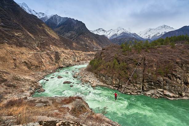 “这就是我们架设扁带的地方,雅鲁藏布江在两座雪山之间拐了个大弯,环境太震撼了!”张亮介绍,“扁带运动起源于攀岩,现在在欧美很流行,但国内还不是很普及。我们这次在大峡谷景区表演了花式扁带和高空扁带,然后又深入峡谷到大拐弯的区域,完成了雅鲁藏布的扁带跨越。”