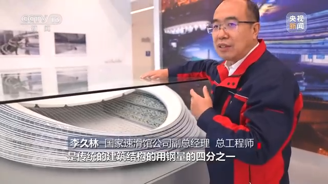 国家速滑馆公司副总经理、总工程师 李久林:通过张拉索,就像做网球拍一样,形成索网结构,只用了几百吨的钢丝就可以实现大型体育场馆的屋顶,是传统建筑结构用钢量的四分之一,充分体现了绿色环保的理念。