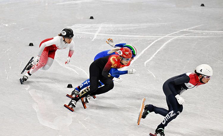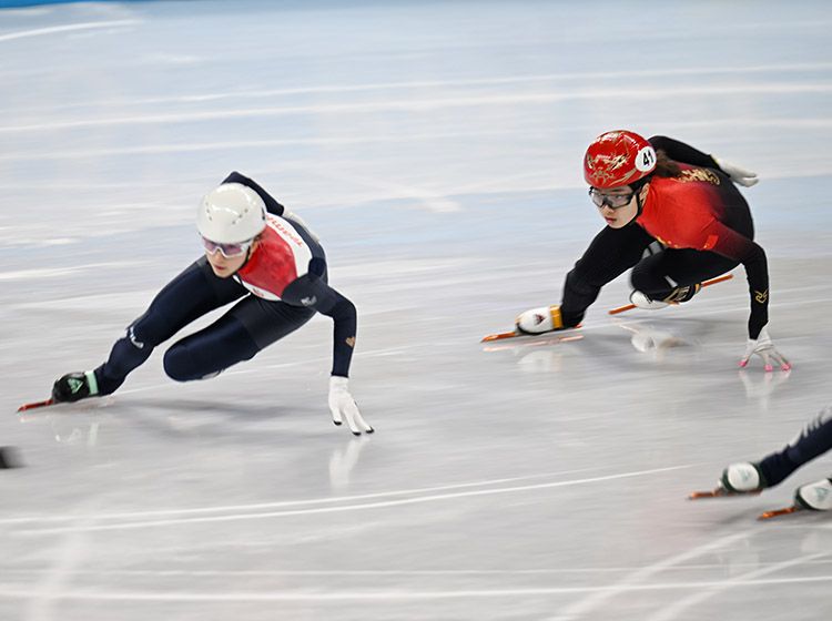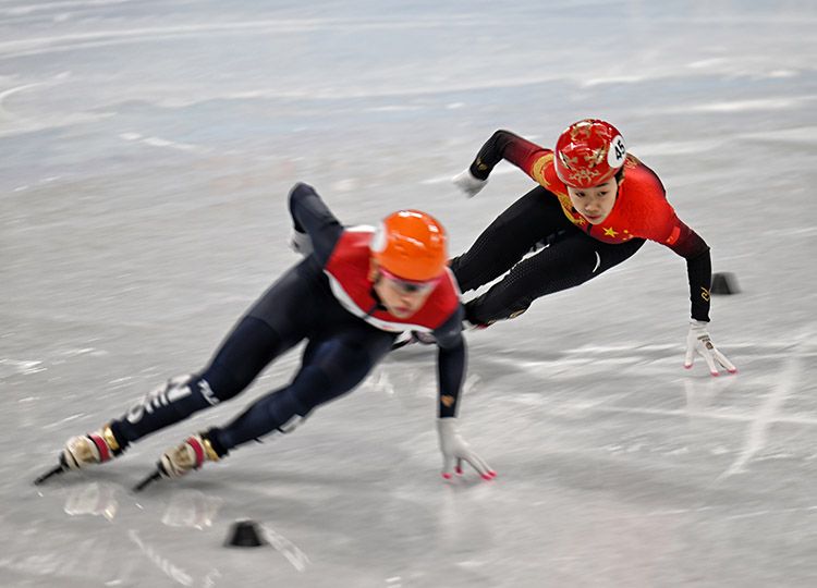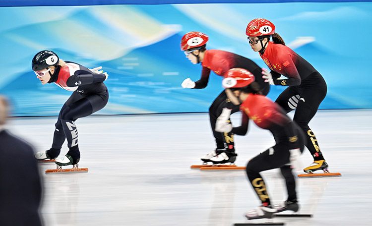 2月9日晚,北京冬奥会短道速滑女子3000米接力半决赛中,中国队由韩雨桐、曲春雨、范可新、张雨婷出战,以4分04秒383的成绩获得小组第二名,晋级决赛。图为:中国队在比赛中紧紧跟随荷兰队。
