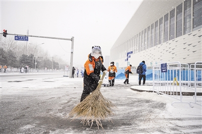奥园环境服务中心综合作业班班长卢海杰介绍:“我们根据雪情调整作业路段安排,对封闭区域的安检口、志愿者之家、办公区域周边做好除雪、防滑措施。现在各类保障车辆、人员比较多,所以必须尽快清除机动车道、步道上的积雪,确保道路不结冰,各方面工作人员可安全出行。”