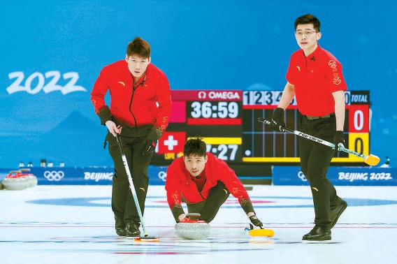 2月16日,在男子冰壶循环赛第11轮中,中国冰壶男队战胜瑞士队。本报记者 邓伟摄