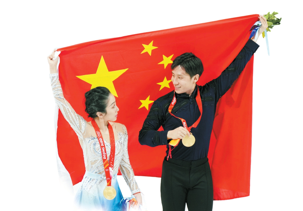 隋文静/韩聪领奖后,高举国旗深情对望。本报记者 方非摄