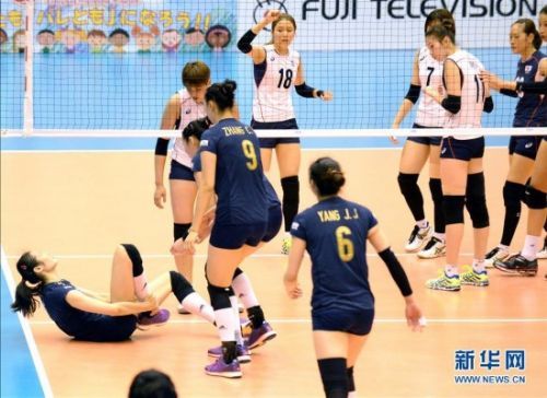 8月26日,中国队球员朱婷(左一)受伤倒地。当日,在日本长野县松本市举行的2015年女排世界杯第四轮比赛中,中国队以3比1战胜韩国队,取得第三场胜利。目前中国女排成绩为3胜1负。新华社记者马平摄