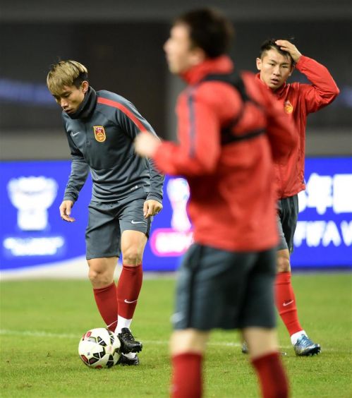 11月11日,中国男足队员郑智(左)在训练中。当日,中国男足在湖南省长沙市进行赛前适应场地训练,备战12日与不丹队进行的俄罗斯世界杯亚洲区预选赛。 新华社记者郭勇摄