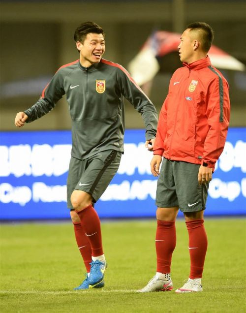 11月11日,中国男足队员梅方(左)在训练中与队友张池明交谈。当日,中国男足在湖南省长沙市进行赛前适应场地训练,备战12日与不丹队进行的俄罗斯世界杯亚洲区预选赛。 新华社记者郭勇摄