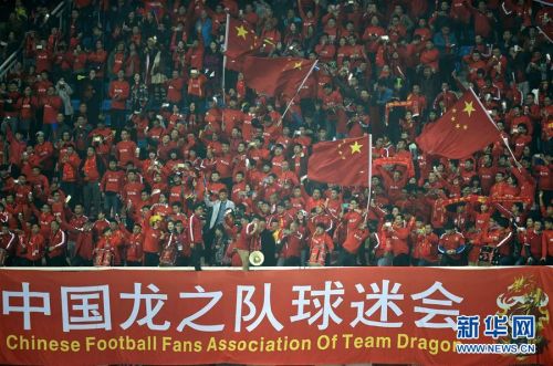 11月12日,中国球迷在看台上为球队加油助威。当日,在湖南省长沙市进行的2018年俄罗斯世界杯亚洲区预选赛中,中国男足国家队主场以12比0战胜不丹男足国家队。 新华社记者郭勇摄
