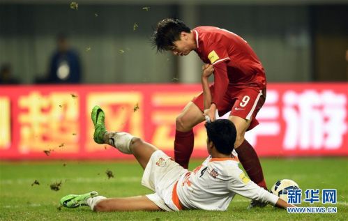 11月12日,中国队球员杨旭(上)在比赛中拼抢。当日,在湖南省长沙市进行的2018年俄罗斯世界杯亚洲区预选赛中,中国男足国家队主场以12比0战胜不丹男足国家队。 新华社记者李尕摄