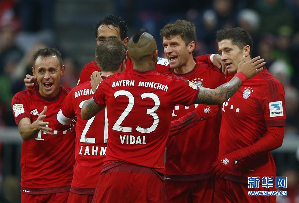 11月28日,拜仁队球员穆勒(右二)进球后与队友庆祝。当日,在2015-16赛季德国足球甲级联赛第14轮比赛中,拜仁慕尼黑队主场以2比0战胜柏林赫塔队。 新华社/路透