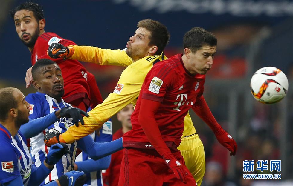 11月28日,拜仁队球员莱万多夫斯基(右)门前抢点。当日,在2015-16赛季德国足球甲级联赛第14轮比赛中,拜仁慕尼黑队主场以2比0战胜柏林赫塔队。 新华社/路透